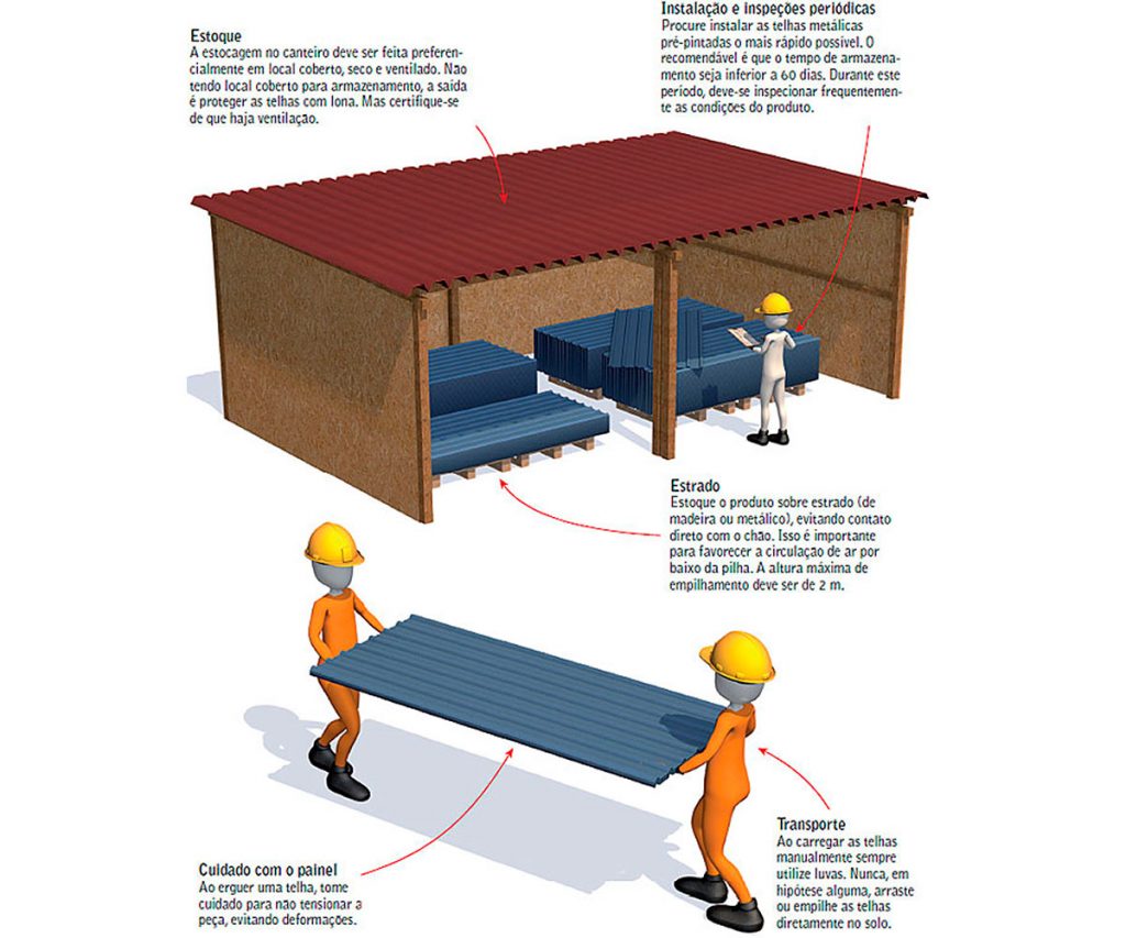 - O período máximo indicado para manter o estoque armazenado conforme essas condições é de até 60 dias. O ideal mesmo é instalar as telhas o quanto antes, mas enquanto isso não for feito, deve-se inspecionar com frequência as suas condições.