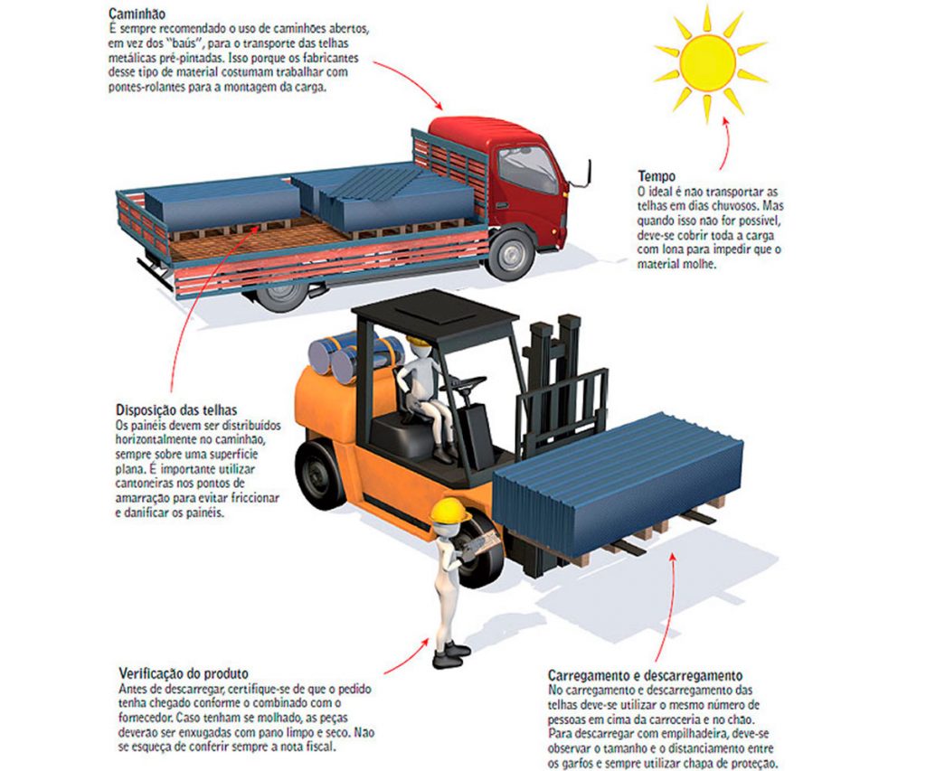 - A maioria dos fabricantes de telhas trabalha com pontes-rolantes para montar a carga. Por isso, use caminhões abertos para realizar o transporte das telhas.